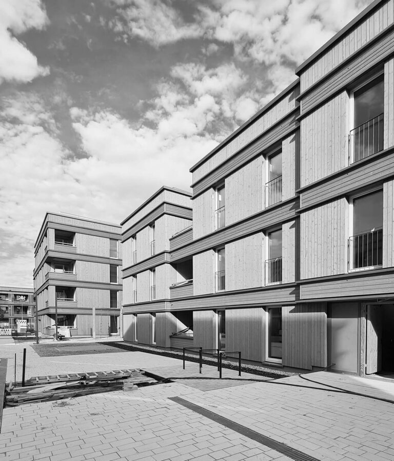 HOCHMUTTINGER an der hochmuttingerstrasse, ecke herbergstrasse in feldmoching sollen auf einem 8,4 ha grossen areal ca. 640 neue wohnungen entstehen. das planungsgebiet liegt im 24. stadtbezirk feldmoching-hasenbergl am nördlichen stadtrand von münchen. innerhalb des bebauungsplanes bearbeiten wir zwei grosse clusterhöfe mit ca. 162 wohnungen im fördermodell EOF, MMM und KMB. zusätzlich werden in zusammenarbeit mit dem sozialreferat neue unterbringungsformen der jugendhilfe, ambulant betreute wohngemeinschaften, zwei sorgende hausgemeinschaften und grossfamilienwohnungen untergebracht. die punkthäuser werden in hybridbauweise als KFW 40 mit hölzerner fassade, die zeilenbebauung in kompletter holzbauweise konstruiert. es werden je nach bautypus mind. 50 – 150kg/m²WF nawaros (nachwachsende rohstoffe) verbaut.