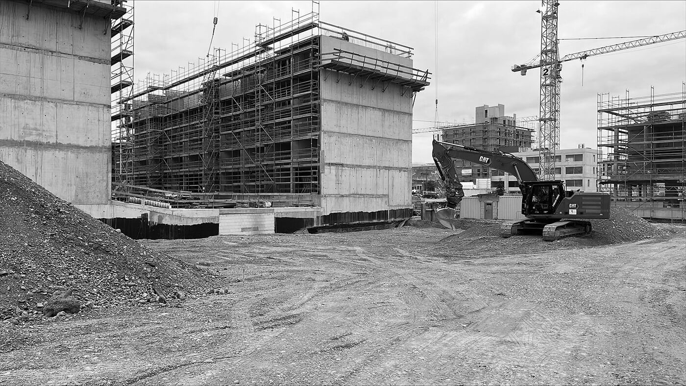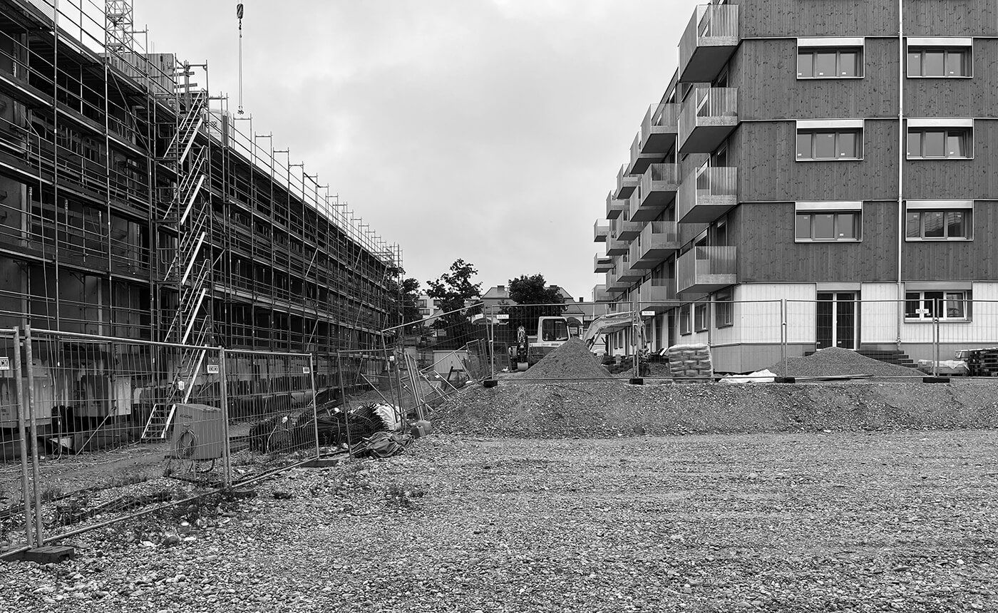 die gewählte konstruktion der hybridbaukörper (stb-skelett mit nichttragenden holzaussenwänden) ermöglicht aufbauend auf der modularen rhythmik eines strengen achsrasters eine maximale flexibilität der wohnungsgrundrisse von der 1-zimmer-studentenwohnung über verschiedene familien- und singelwohnungen bis hin zur wohngemeinschaft mit mehreren personen. die holzrahmenbauwände werden mit einer hinterlüfteten holzschalung bekleidet. zusammen mit der spielerischen setzung der fenster und seiner farblichen gestaltung entsteht am zentralen wegekreuz des neuen quartiers ein gebäude, das seiner städtebaulichen bedeutung rechnung trägt.